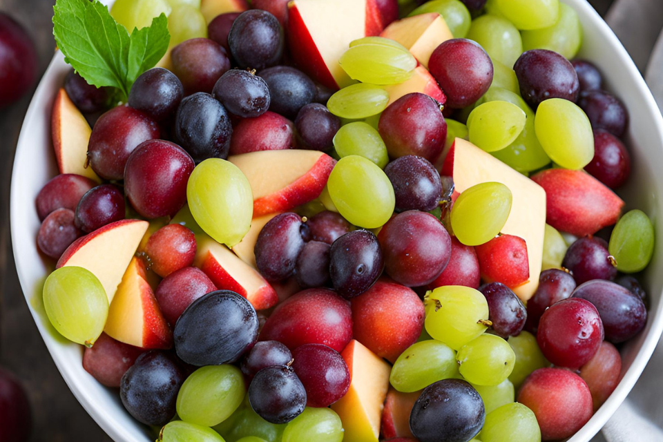 Prereži bobice grožđa (po mogućnosti koristi ono bez sjemenki!) na polovice i stavi sa strane. Jabuke nareži na komadiće, otprilike iste veličine kao i grožđe. Prelij jabuke limunovim sokom da spriječiš oksidaciju.